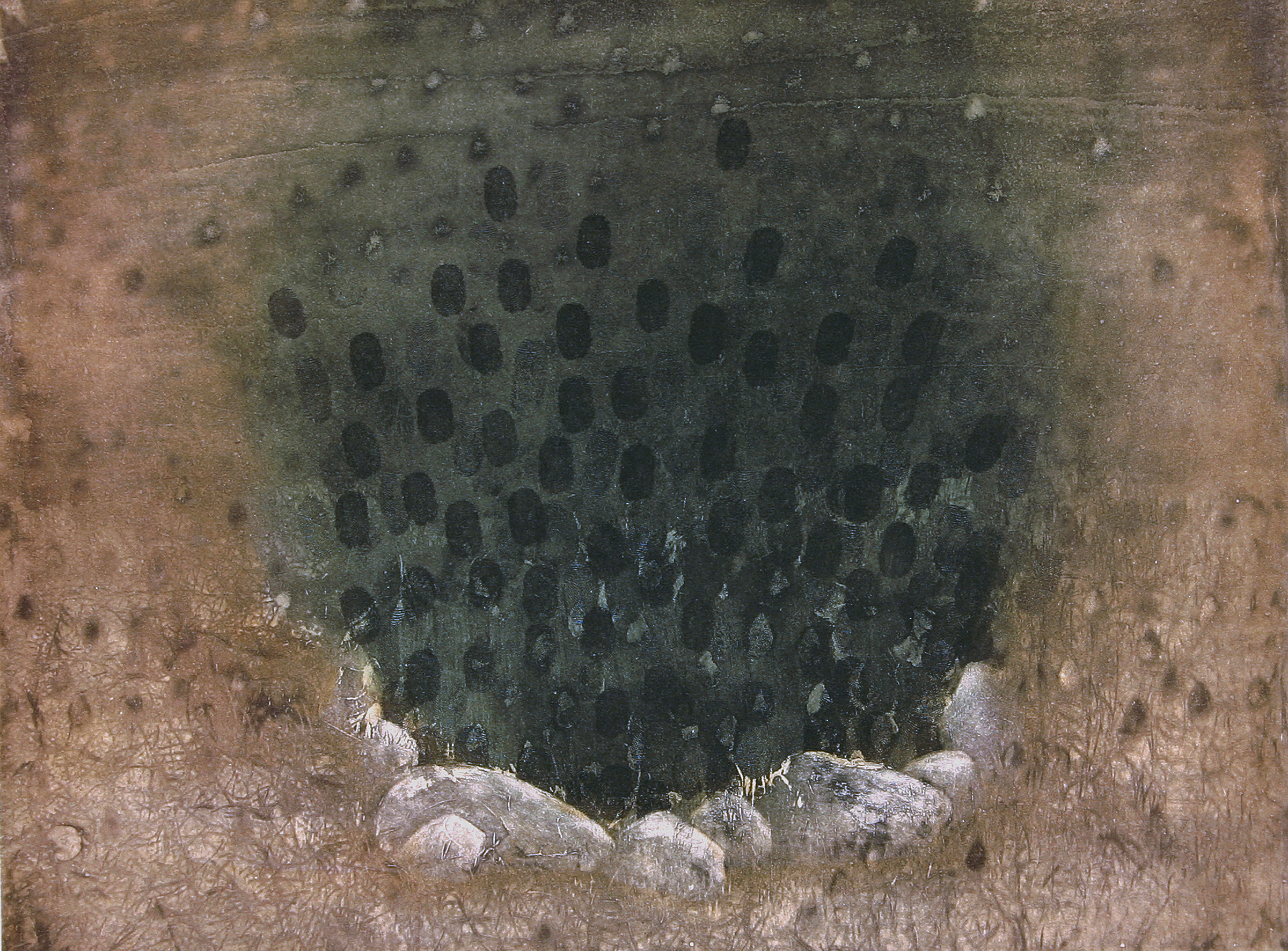 Implosion Published 2022/02/15 at 2400 × 1772 in Implosion Photo-etching with crayons lift on handmade paper. 11 x 14″ 2006 “Pocahontas Meets Hello Kitty: Native American Women Voices”, invitational portfolio exchange. Organized by Melanie Yazzie, associate professor, University of Colorado-Boulder.