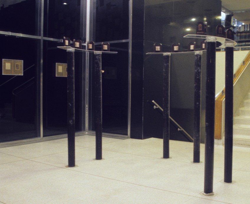 Hours of Litanies._installation view Published 2011/10/16 at 1500 × 1227 in Installations 1996 (12) books: handmade paper, cedar, purple heart, thread, guilding 4 x 6 x 2″ book details seen on Artist Books page acrylic pillars filled with dirt Like Loading...