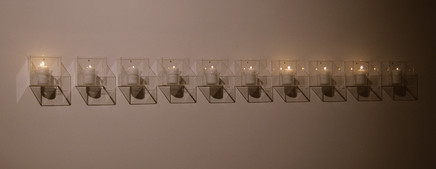 Reflecting 9/11_installation view Published 2011/10/16 at 1500 × 583 in Installations (10) acrylic boxes 3″ cubed, vinyl letters, candles variable dimensions Like Loading...