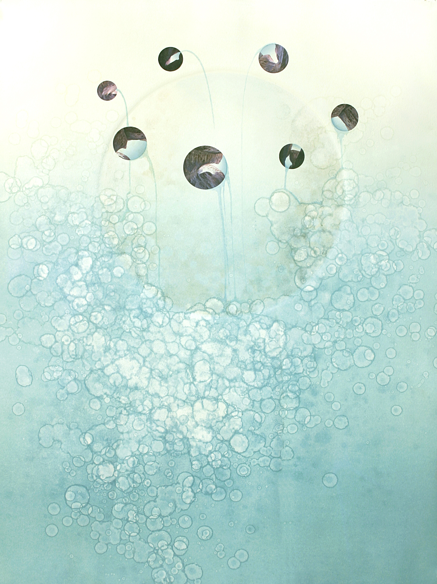 In the last several years I have become interested in working on a much larger scale for intaglio prints, which traditionally have been more modest in scale due to etching bath and rosin box size restrictions. Since I am limited in my capacity to etch large in the studio at ASU I have turned to international residencies where I can work significantly larger with aquatint etching. This has been a great opportunity for me to explore intaglio in combination with collage, screenprint, and painted elements. The large-scale etchings also focus on the mark of the hand using the white ground etching technique a more painterly approach to mark and aesthetics; while the photogravure is generally small(er) is scale and focuses on the digital/photographic element.  In some works, such as “Swimming”, these two techniques are combined together using multiple plates tiled when printed to attain the larger scale I am interested in. ~ Mary Hood