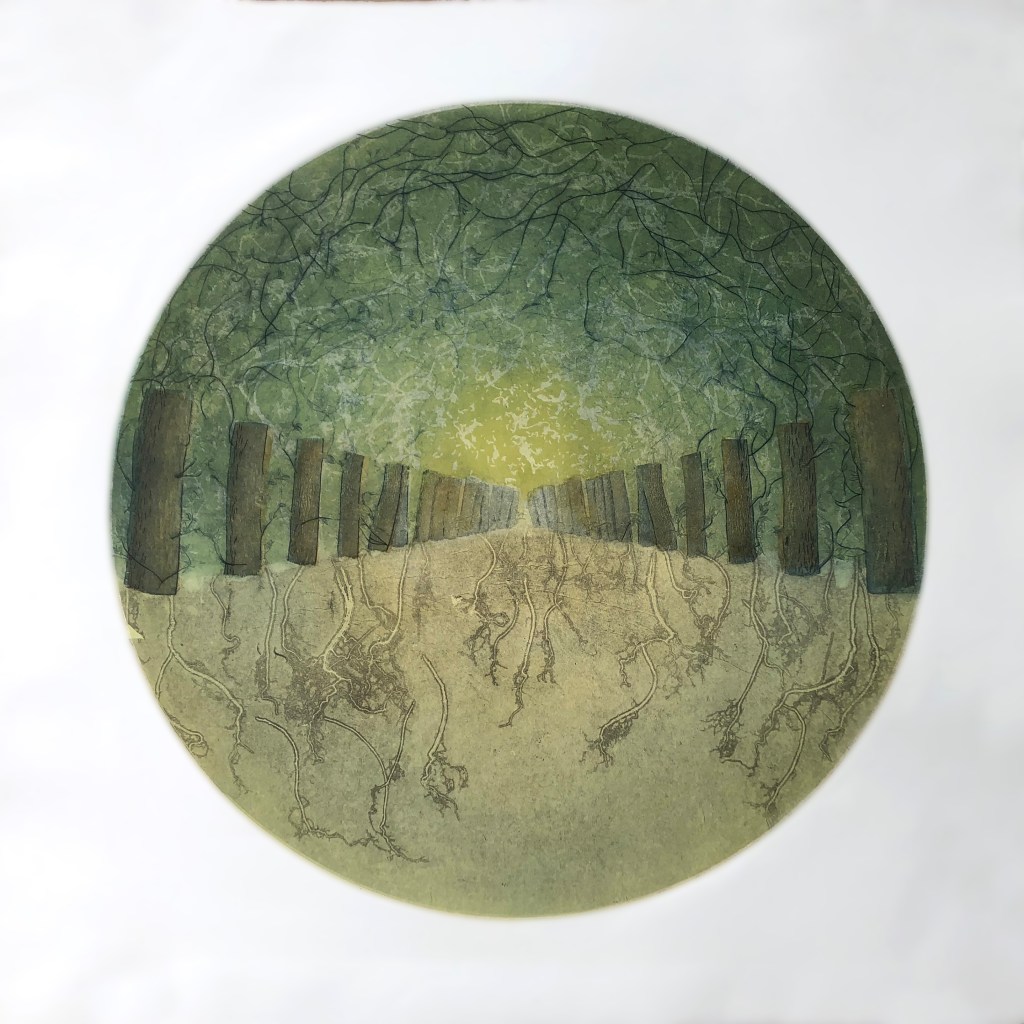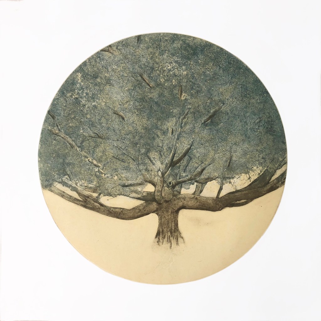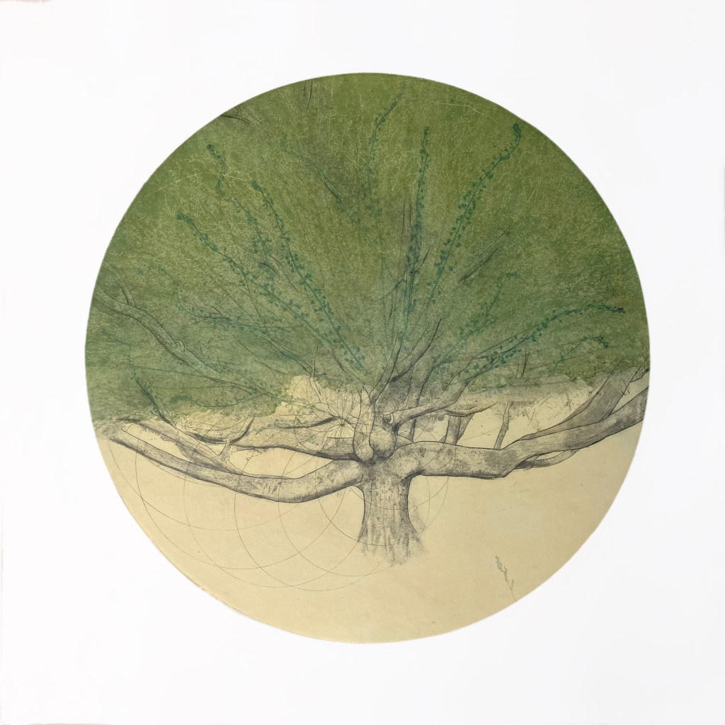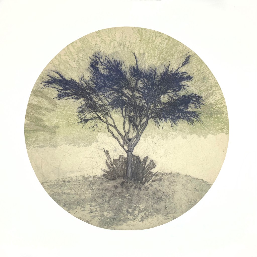 Trees are a part of our life stories and serve as a reminder of our interdependence with the natural world. We need trees for survival, just as we need water and air. “The Overstory” by Richard Powers masterfully crafts the threads the connections between us by offering stories of that pan generations and stories that live in the moment. This book, along with “The Hidden Life of Trees” by Peter Wohlleben were the books that I was reading when the Covid Pandemic hit the world. I found myself contemplating the role trees play in my own story, the vital importance of shade in Arizona, the provider of food, the stabilizer of the ground from erosion, and the endless variations of colors, textures, and patterns. While traveling back to Wisconsin from Arizona in March of 2019 I was comforted by the familiarity of the trees, especially the trees I had previously noticed during my many stops at dog parks along the way. From the graceful Palo Verde, Ficus, and Pine in Arizona to the massive White Oaks in Nebraska, the Maple and Oak in Wisconsin, and the sturdy Beechnut in my back yard, the trees gave me great comfort and reminded me of stability and strength in a time of uncertainty. Beginning in 2019 I turned my creative energy to my recent series of large format etchings to reflection on pandemic realities through the lens of what we can learn from trees. Using trees metaphorically I am exploring the realities of loss, isolation, interdependence, rebirth, strength, stability, and community.