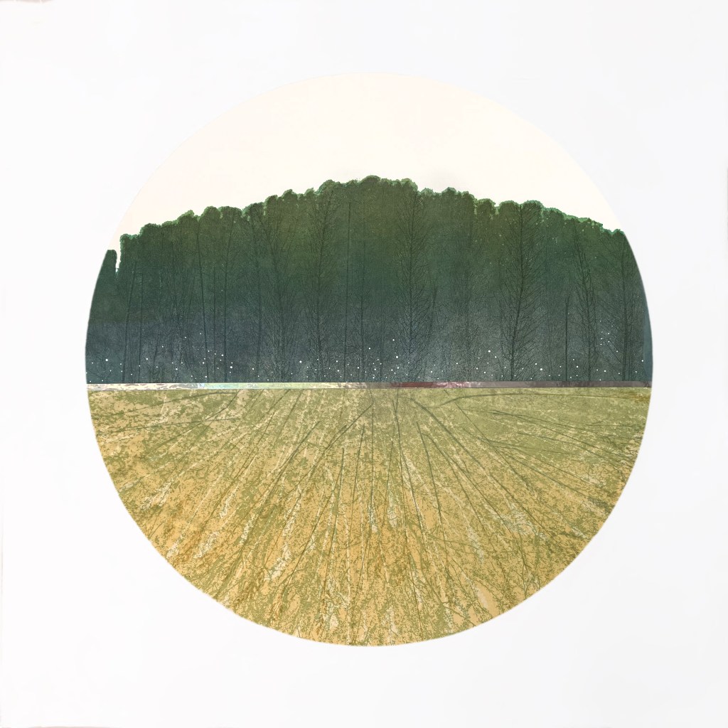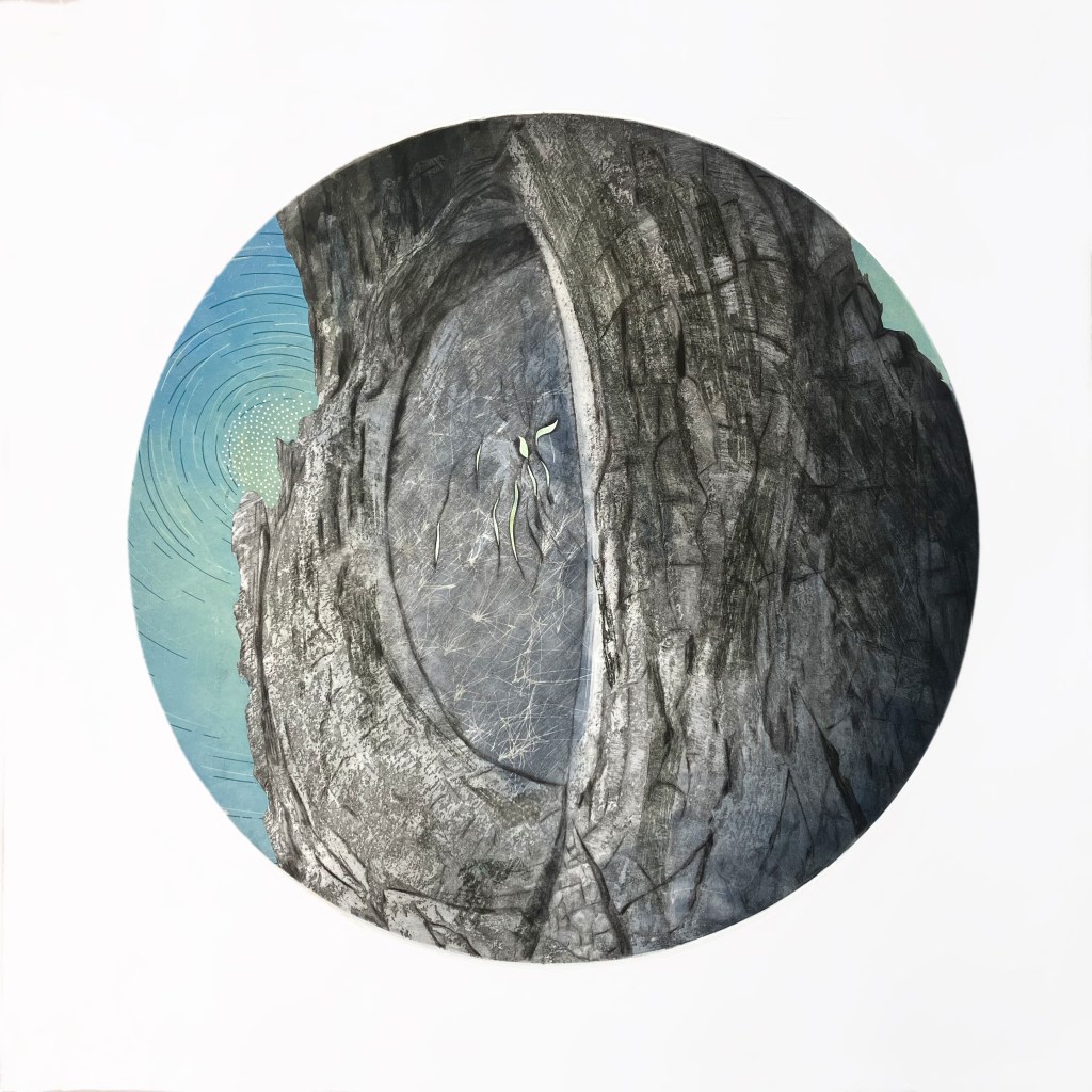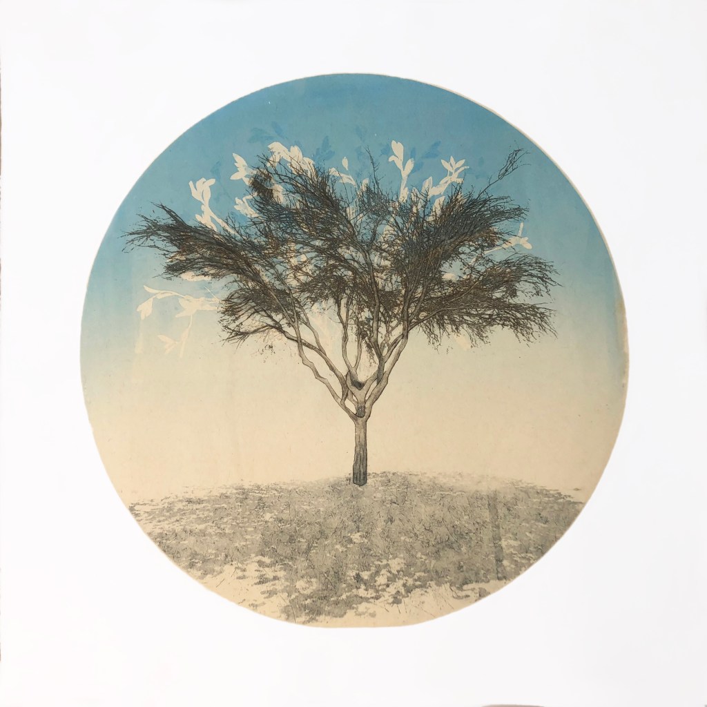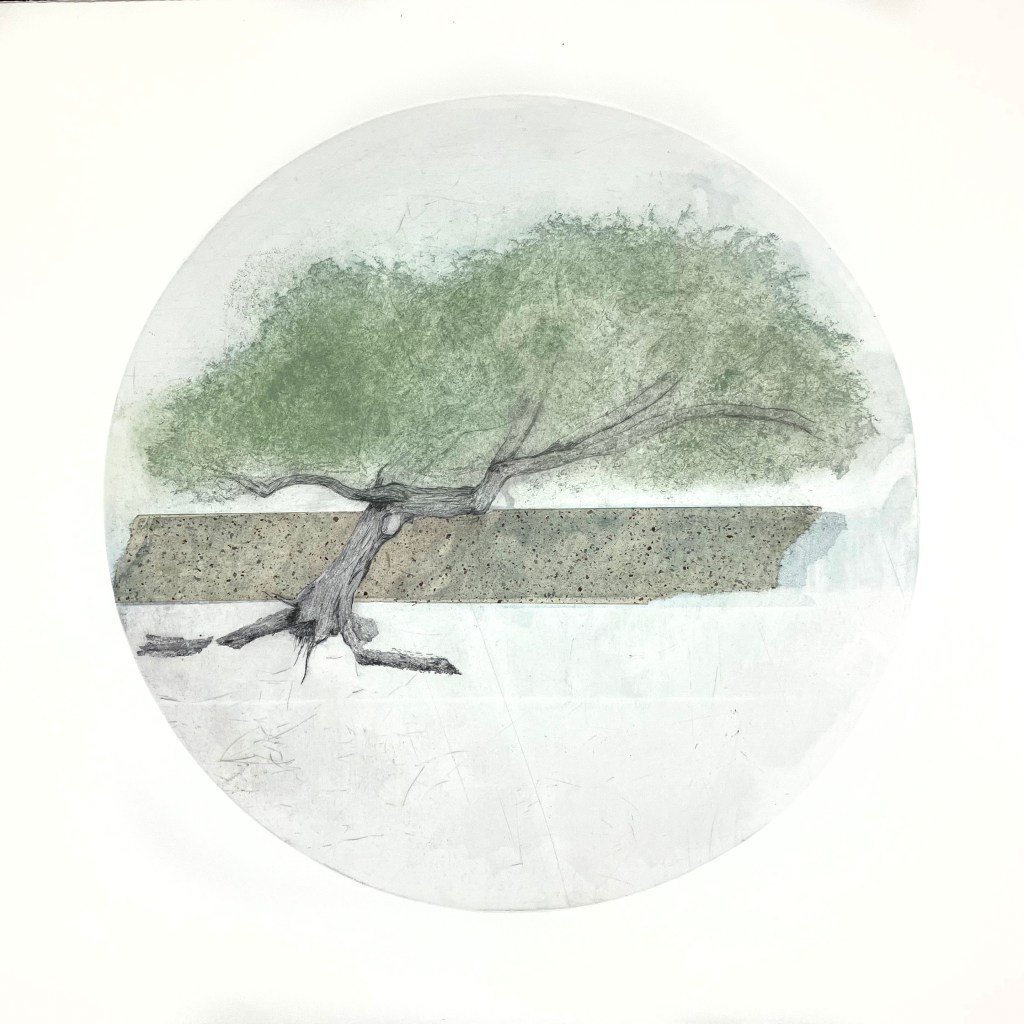 Trees are a part of our life stories and serve as a reminder of our interdependence with the natural world. We need trees for survival, just as we need water and air. “The Overstory” by Richard Powers masterfully crafts the threads the connections between us by offering stories of that pan generations and stories that live in the moment. This book, along with “The Hidden Life of Trees” by Peter Wohlleben were the books that I was reading when the Covid Pandemic hit the world. I found myself contemplating the role trees play in my own story, the vital importance of shade in Arizona, the provider of food, the stabilizer of the ground from erosion, and the endless variations of colors, textures, and patterns. While traveling back to Wisconsin from Arizona in March of 2019 I was comforted by the familiarity of the trees, especially the trees I had previously noticed during my many stops at dog parks along the way. From the graceful Palo Verde, Ficus, and Pine in Arizona to the massive White Oaks in Nebraska, the Maple and Oak in Wisconsin, and the sturdy Beechnut in my back yard, the trees gave me great comfort and reminded me of stability and strength in a time of uncertainty. Beginning in 2019 I turned my creative energy to my recent series of large format etchings to reflection on pandemic realities through the lens of what we can learn from trees. Using trees metaphorically I am exploring the realities of loss, isolation, interdependence, rebirth, strength, stability, and community.
