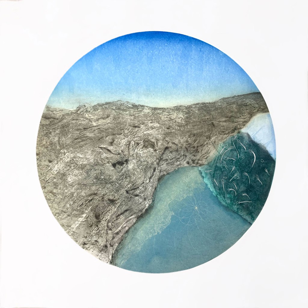 The series has a total of 12 etchings 24″ diameter plates combined with methods such a monotype and/or chine colle, and mixing and/or re-etching into plates, I created variable editions on 30″ sq paper, yielding over 100 unique impressions. I used the laser engraver to vaporize spray paint off copper, thus creating a mask which traditional intaglio techniques such as aquatint, soft ground, and line etch could be applied. Each impression, though originating with a singular plate has many variations; just as the seed once planted grows trees that are at once individual yet part of a larger community.